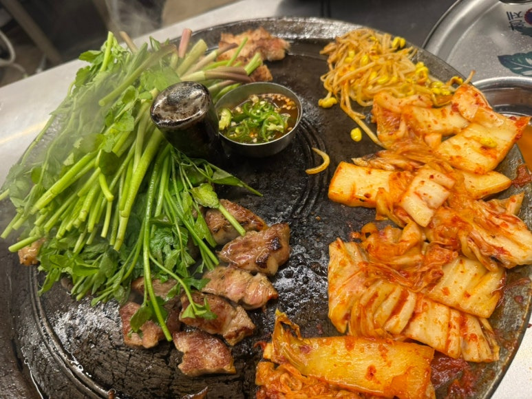 미나리를 곁들여서 솥뚜껑에 고기를 구워먹을 수 있는 곳이에요